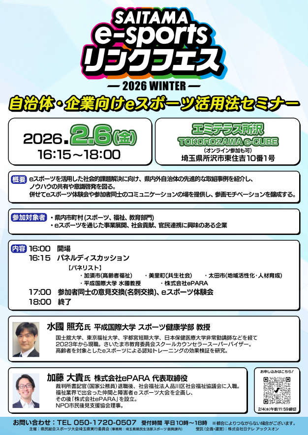 2026年1月28日 11時40分 [事務局07]埼玉県では、性別や、障害の有無に関わらず、子どもから高齢者まで楽しめるeスポーツの普及・裾野拡大に取り組んでいるところです。この度eスポーツを活用した社会課題の解決に向けて、先進的な取組を実施している県内外の市町村の事例を紹介する「自治体・企業向けeスポーツ活用法セミナー」を開催します。